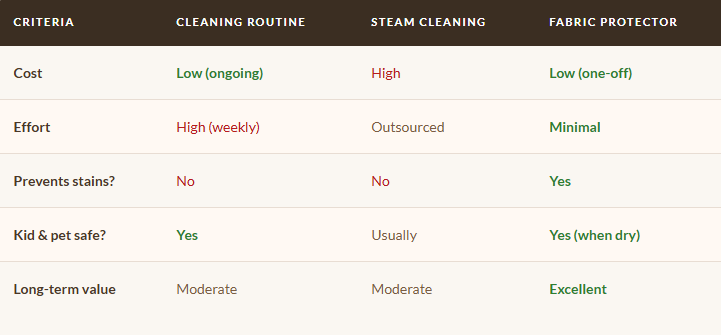 Think of it as an investment in the thing you already invested in. A bottle of Scotchgard costs a fraction of what you paid for your sofa — and it could save you from a professional cleaning bill, or worse, a premature replacement. For families with kids and pets, it's not a luxury; it's common sense wearing a very elegant disguise.